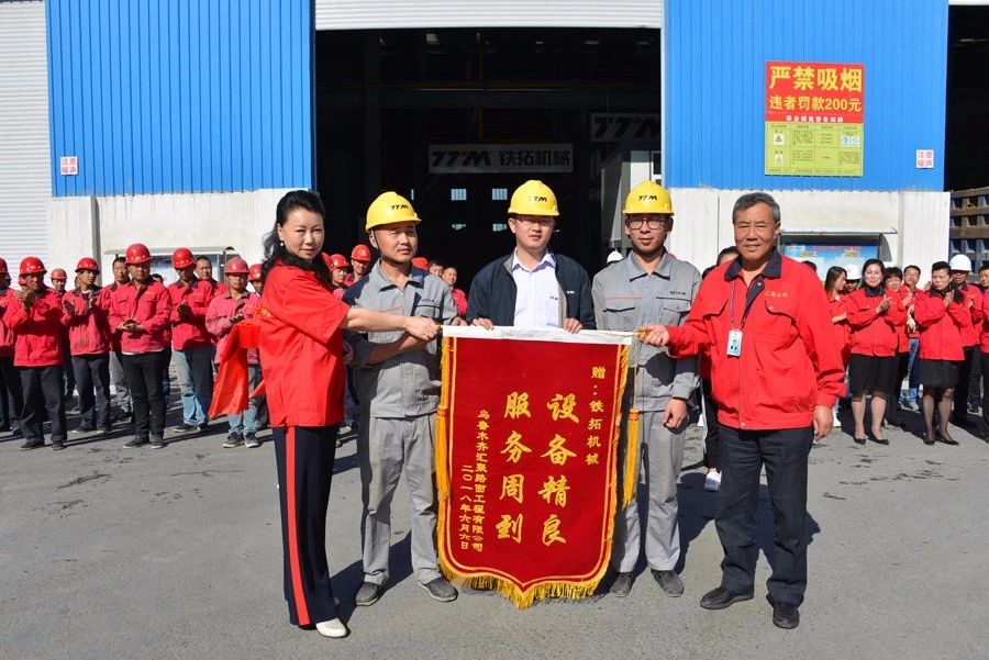 剪彩儀式結(jié)束后,隋思玉董事長親自贈(zèng)予鐵拓機(jī)械“設(shè)備精良,服務(wù)周到”紅色大錦旗,對(duì)鐵拓機(jī)械在項(xiàng)目實(shí)施過程的各項(xiàng)工作給以肯定。